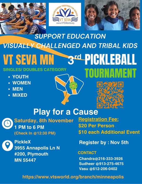 Join us for an exciting day of Pickleball -- where every game you play helps support blind school children and tribal students' education through VT Seva's service initiatives.