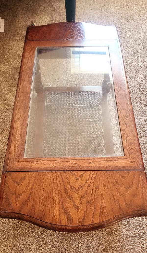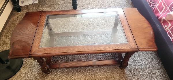 Rectangular wooden with glass top and extended leaflet at both end. Good condition for an immediate move out sale.