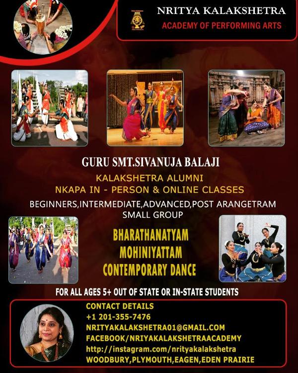 Nritya Kalakshetra has been an active contributor across many all social/regional events in the twin cities and other parts of the United States and India. Guru Sivanuja Balaji"s students are involved in a variety of performances ranging from Kalakshetra Style Bharatanatyam, Mohiniattam [Indian Classical forms] and Kuchipudi through contemporary dances and performances. The school has been contributing to the growth of this ancient art through focused teaching on the depth of Bharatanatyam, Natyashastras, facial expressions called Abhinaya, and yoga to improve dance posture and stamina. The classes delivered by NKAPA also focus on the 'Theory of Dance' and 'Theatre Performances'.
